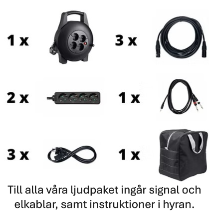 LJUDPAKET PREMIUM Ett komplett PA-system från JBL I paketet ingår allt för att ansluta dator/mobiltelefon etc. Möjligheten att koppla in RCA, tele och XLR eller via Bluetooth finns även för att ansluta till exempel ett DJ-mixerbord, keyboard, mikrofon eller liknande. Paketet passar för medelstora till mindre sällskap (ca 60 personer, beroende på lokal) eller för bakgrundsmusik och kan hämtas i en större bil. Vid behov kan leverans och installation bokas. inkluderar: - 2 x JBL PRX915 topphögtalare - 2 x högtalarstativ - 1 x Yamaha MG06 mixer - 4 x JBL PRX18XLF subbas För lång hyra, begär offert för ett bättre pris. Pris: 3 500,00 kr per dygn